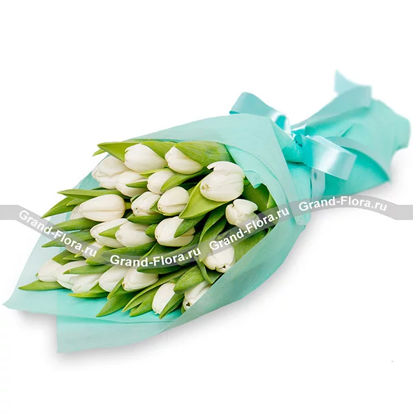 Необыкновенно  свежее и оригинальное сочетание белых тюльпанов и бирюзовой упаковки. Белоснежное обаяние тюльпанов.